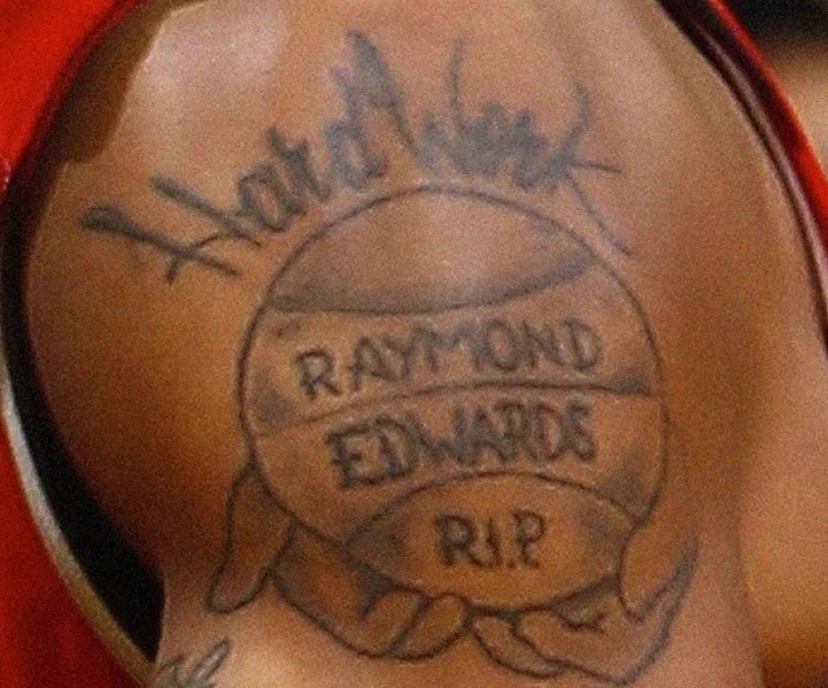 “如果我不打籃球的話,舅舅不會開心的。同時(shí),我要承擔(dān)起責(zé)任,成為一家之主?!彼诩绨蛏衔牧艘粋€(gè)文身,在一雙祈禱的手上,刻著“努力工作”這幾個(gè)字,雙手握著一個(gè)籃球,籃球上寫著,“雷蒙德-愛德華茲,RIP”,努力工作、祈禱和籃球,這是他和舅舅之間,最牢不可破的紐帶。