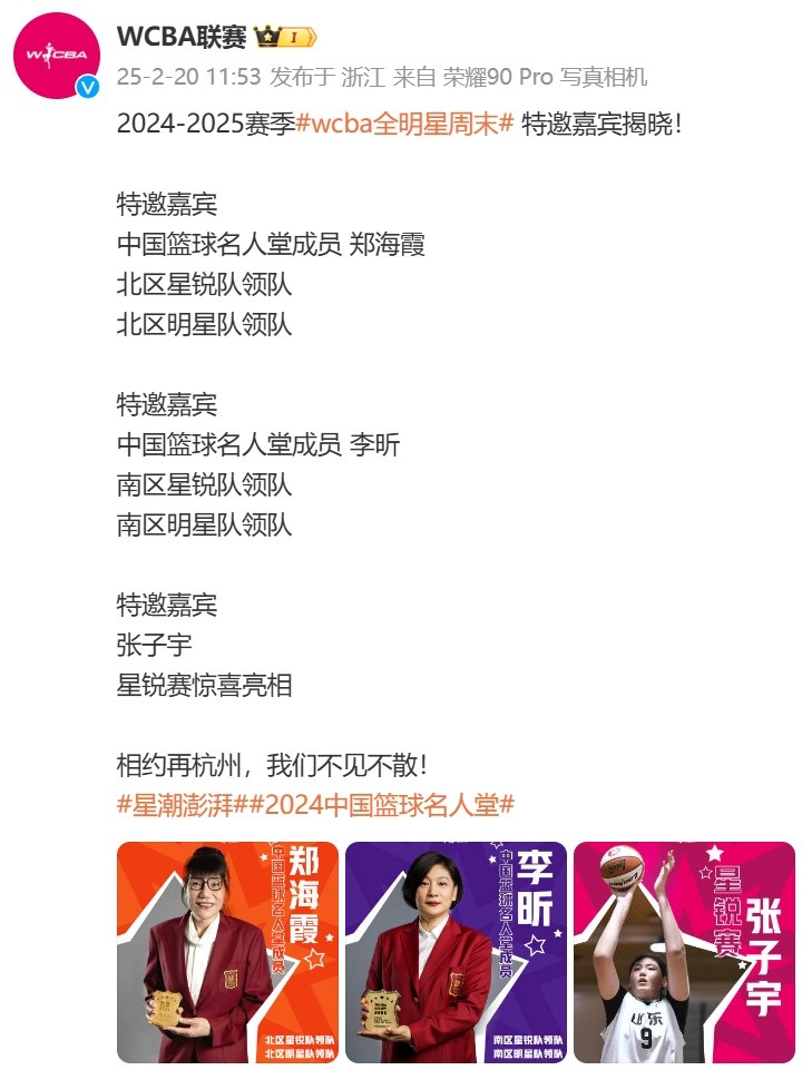 WCBA聯(lián)賽官方微博發(fā)文公布了三位特邀嘉賓,分別是鄭海霞、李昕和張子宇,原文如下: