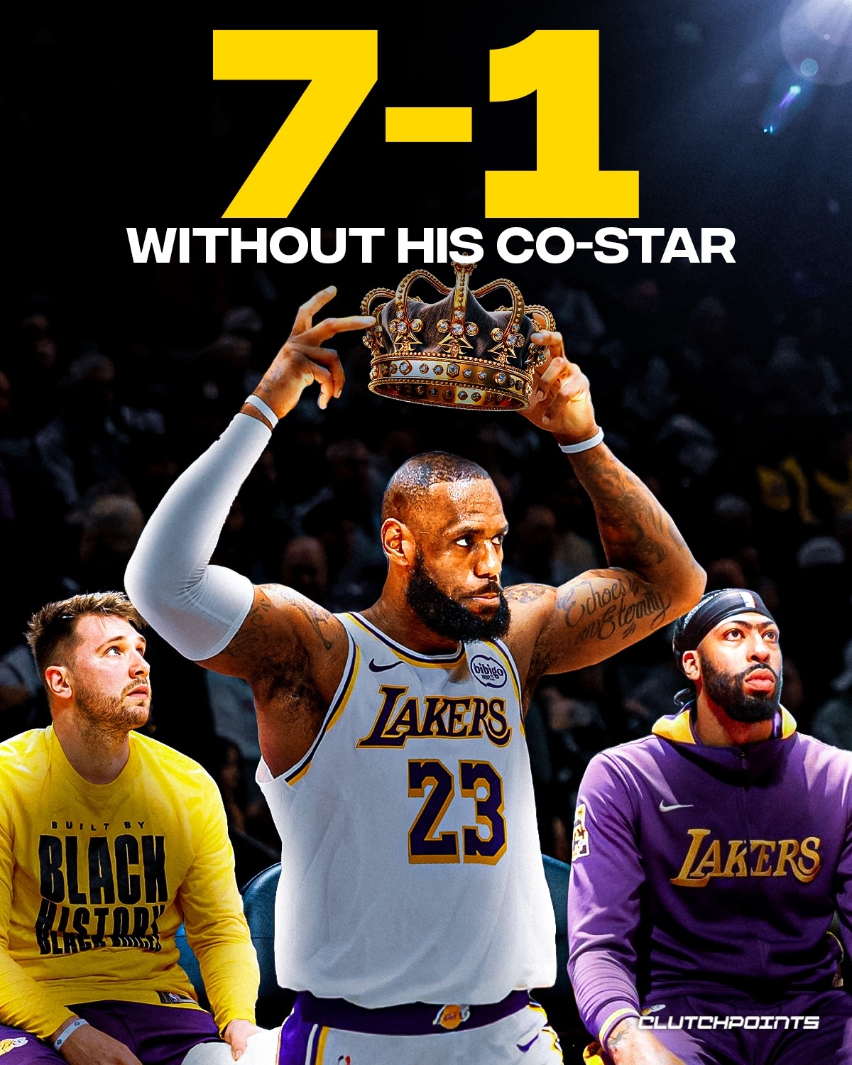 本賽季至今,詹姆斯在濃眉或者東契奇缺陣的情況下,場(chǎng)均砍下33.9分8.0籃板8.3助攻,真實(shí)命中率70.1%,帶隊(duì)7勝1負(fù)。