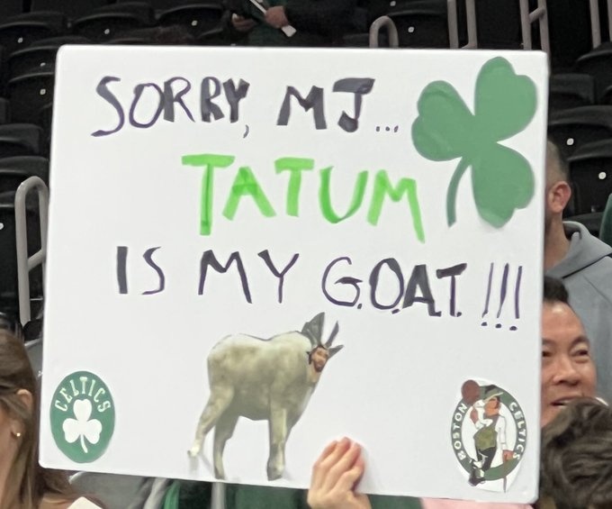 賽前,綠軍主場(chǎng)球迷舉牌,上面貼著塔圖姆頭像的山羊和綠軍隊(duì)徽,配文寫道:“對(duì)不起了MJ(喬丹),塔圖姆才是我心目中的GOAT(山羊,歷史最佳之意)?!?/p>