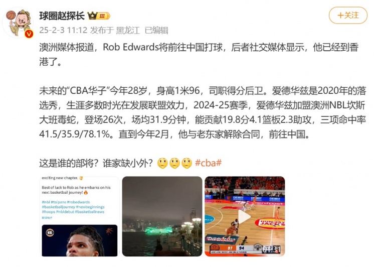 2月3日訊 今日,據(jù)媒體人球圈趙探長透露,澳洲媒體報道,羅伯-愛德華茲(Rob Edwards)將來中國打球,后者社交媒體顯示,他已經(jīng)到香港了。