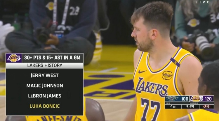 截至發(fā)稿前,湖人球星東契奇已砍下30分15助攻,成為湖人隊(duì)史單場同時(shí)拿到30+得分和15助攻的第4人。前三位分別是杰里-韋斯特、魔術(shù)師約翰遜和勒布朗-詹姆斯。