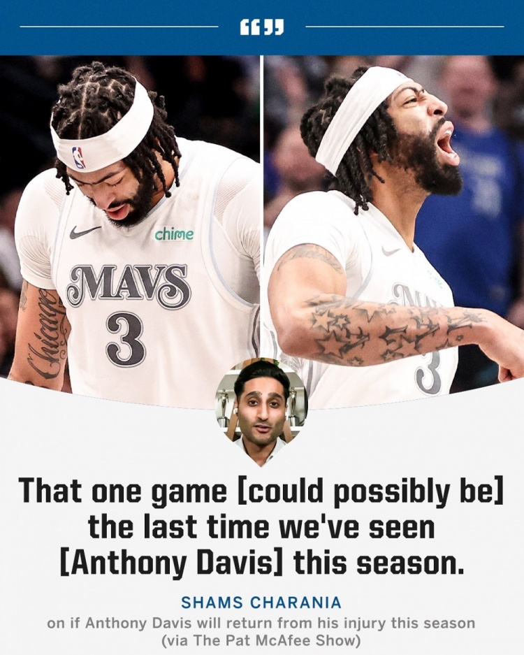 名記Shams在播客節(jié)目中也談到了獨(dú)行俠另一位球星安東尼-戴維斯的情況:“安東尼-戴維斯自獨(dú)行俠首秀以來(lái)就一直缺陣,我認(rèn)為他和他的經(jīng)紀(jì)團(tuán)隊(duì)會(huì)進(jìn)行商討,并且會(huì)有一些非常艱難的對(duì)話,不能排除這樣的可能性——那場(chǎng)比賽可能是我們本賽季最后一次看到安東尼-戴維斯出戰(zhàn)?!?/p>
