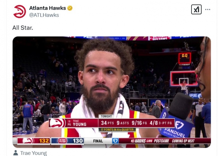 賽后,老鷹官推曬出了特雷-楊的采訪照片,配文:“他是全明星?!?/p>