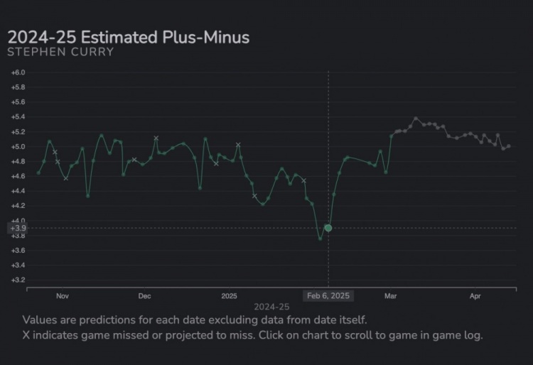 非常有趣的是,斯蒂芬的預(yù)計(jì)正負(fù)值在勇士隊(duì)交易得到吉米之后就完全像火箭一樣飛升了。