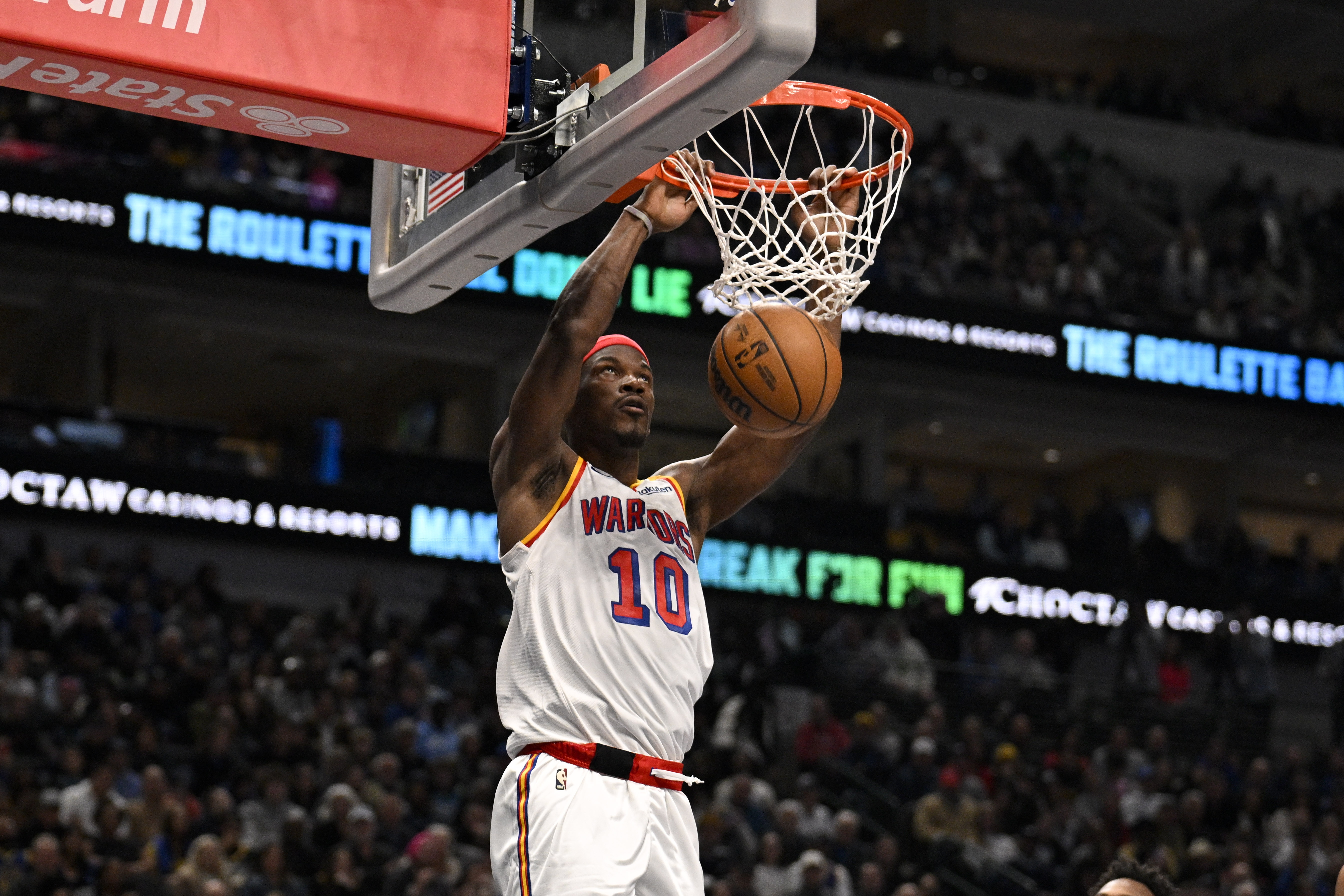 巴特勒并沒有用超級(jí)巨星的表現(xiàn)壓倒對(duì)手,在勇士隊(duì)他場(chǎng)均可以得到還算不錯(cuò)的16.3分、5.3個(gè)籃板、5.3次助攻和1.1次搶斷,上場(chǎng)時(shí)間為30.6分鐘。(我說(shuō)“還算不錯(cuò)”是因?yàn)楸举惣局挥?3名其他球員達(dá)到這些數(shù)據(jù),除了德斯蒙德-貝恩,其他人都至少入選過(guò)一次全明星。)巴特勒在投籃方面的表現(xiàn)很掙扎——自從交易以來(lái),他20次三分球出手投丟了18個(gè),在油漆區(qū)的投籃命中率僅為53.3%,低于本賽季早些時(shí)候在邁阿密熱火隊(duì)時(shí)的61.2%——而且在過(guò)去的幾場(chǎng)比賽中有所下滑,部分原因是背部痙攣,部分原因是整體進(jìn)攻停滯。