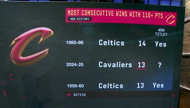 這13連勝期間,騎士得分都至少是110,他們也成為歷史第3支至少砍下13連勝且得分都在110+的球隊。