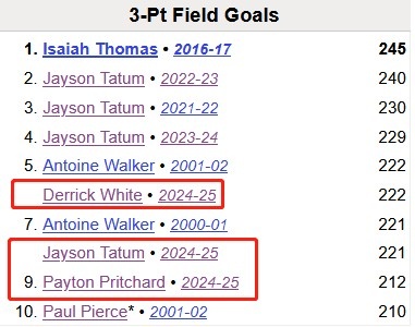 據(jù)統(tǒng)計(jì),本賽季凱爾特人有3員大將有望沖擊隊(duì)史單賽季的三分命中數(shù)紀(jì)錄,算上今天的數(shù)據(jù),分別為: