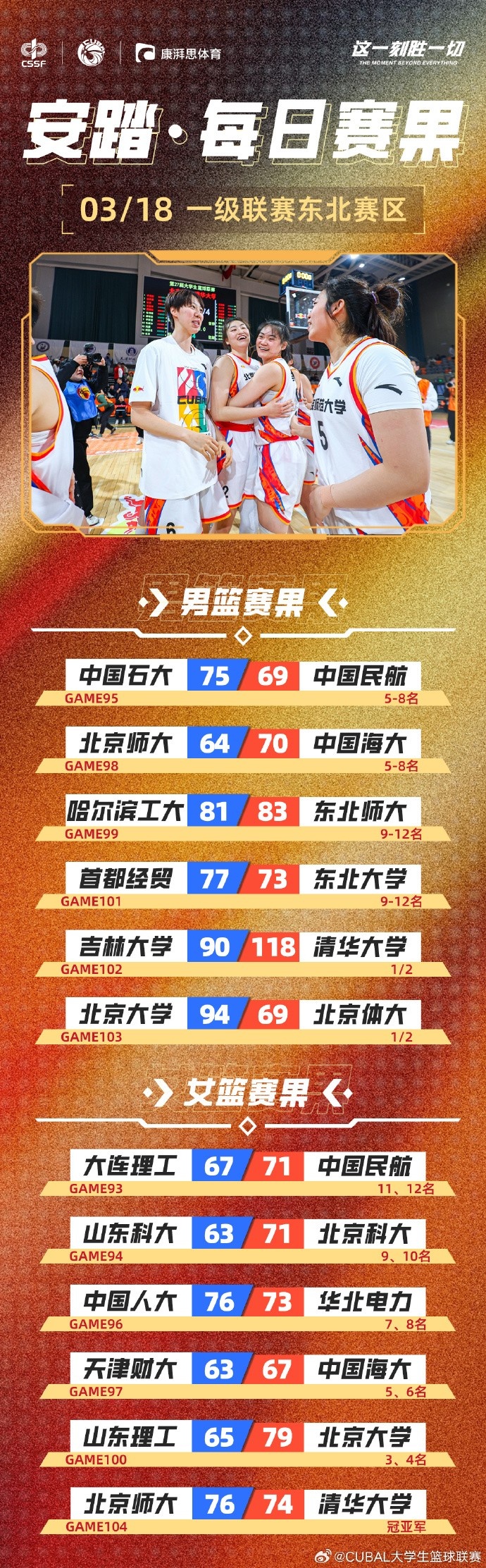 CUBAL今日賽果:北師大女籃雙加時(shí)險(xiǎn)勝清華大學(xué) 拿回東北王的寶座
