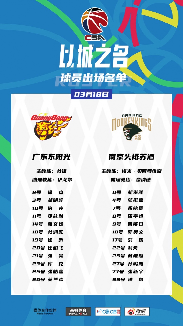 廣東大名單:徐杰、胡明軒、伯克、貝茲利、張文逸、杜潤(rùn)旺、徐昕、任駿飛、張昊、庫(kù)克、張皓嘉、莫蘭德