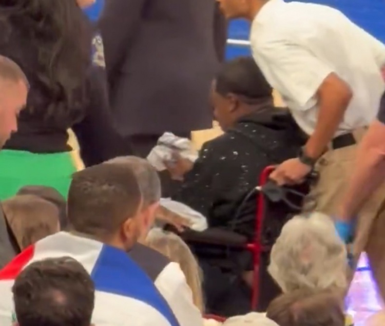 這位觀眾名叫崔西-摩根,是美國一位喜劇演員,也是尼克斯的死忠粉。他在場邊觀戰(zhàn)時突然流鼻血,幾乎站不起來,最后被輪椅推出場外。