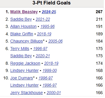以上為本場(chǎng)賽前活塞隊(duì)史單賽季三分命中數(shù)前十