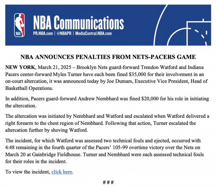3月22日訊 NBA官方今天公布了籃網(wǎng)步行者沖突的處罰結(jié)果,沃特福德和邁爾斯-特納分別罰款3.5萬美元,內(nèi)姆哈德罰款2萬美元。