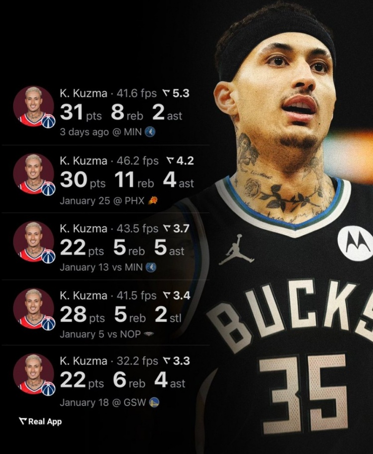 據(jù)統(tǒng)計,本賽季當(dāng)庫茲馬出戰(zhàn)時間大于30分鐘時(13場比賽),他場均能得到21.7分6.4籃板2.4三分,投籃命中率45.4%,三分命中率36%。
