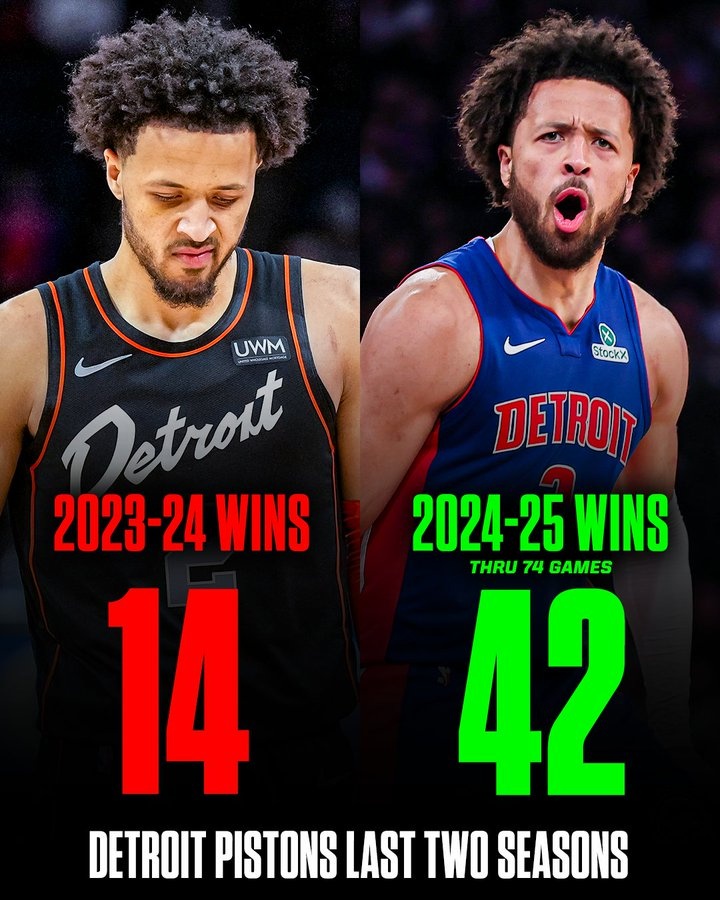據(jù)統(tǒng)計,活塞上賽季只有14勝,本賽季至今已經(jīng)42勝。他們也成為NBA歷史上第一支贏球場數(shù)是上賽季3倍的球隊!