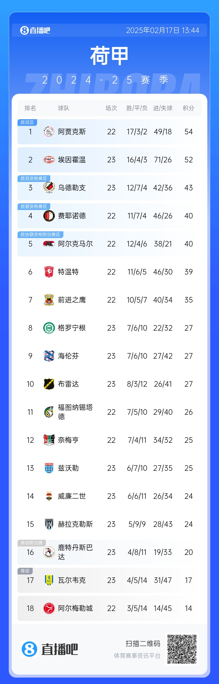 此外,周中這兩家爭冠的荷甲豪門還都有歐戰(zhàn)任務(wù),不過阿賈克斯首回合2-0勝圣吉羅斯,埃因霍溫則比較艱難,他們首回合1-2不敵尤文圖斯。