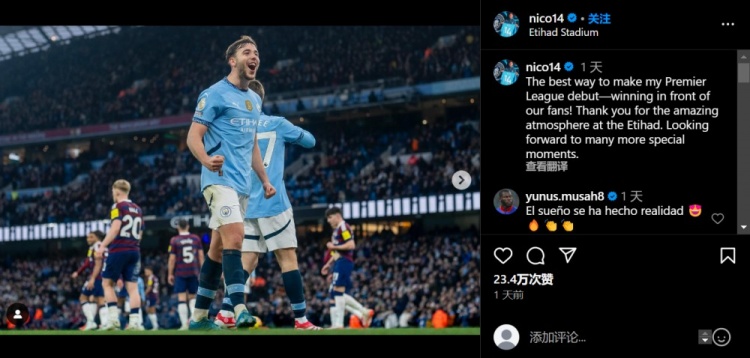 賽后這名中場在社媒發(fā)文紀念自己的英超首秀:在我們的球迷面前贏下比賽,這是我英超首秀的最佳方式。感謝伊蒂哈德營造的不可思議的氛圍,期待更多特別的時刻。