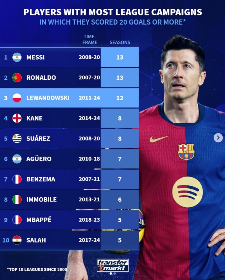 2月19日訊 萊萬在昨日西甲打進制勝球幫助巴薩取勝,他也達成了本賽季聯(lián)賽20球里程碑,這也是他五大聯(lián)賽生涯第12次做到,新世紀僅次于梅西和C羅。