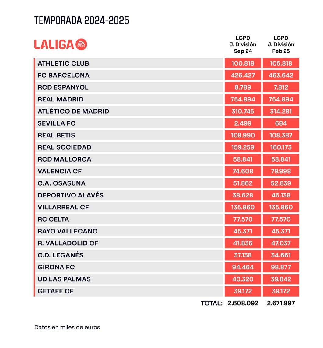 2月19日訊 西甲官方在冬窗后更新了更新的各隊(duì)工資帽,皇馬7.55億歐居首,巴薩4.64億歐第二。