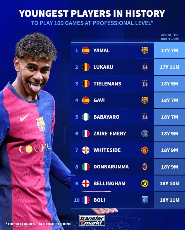 2月19日訊 德轉(zhuǎn)統(tǒng)計(jì)了歐洲前10聯(lián)賽各項(xiàng)賽事出場(chǎng)100次最年輕球員榜,17歲7個(gè)月的亞馬爾排名第一。