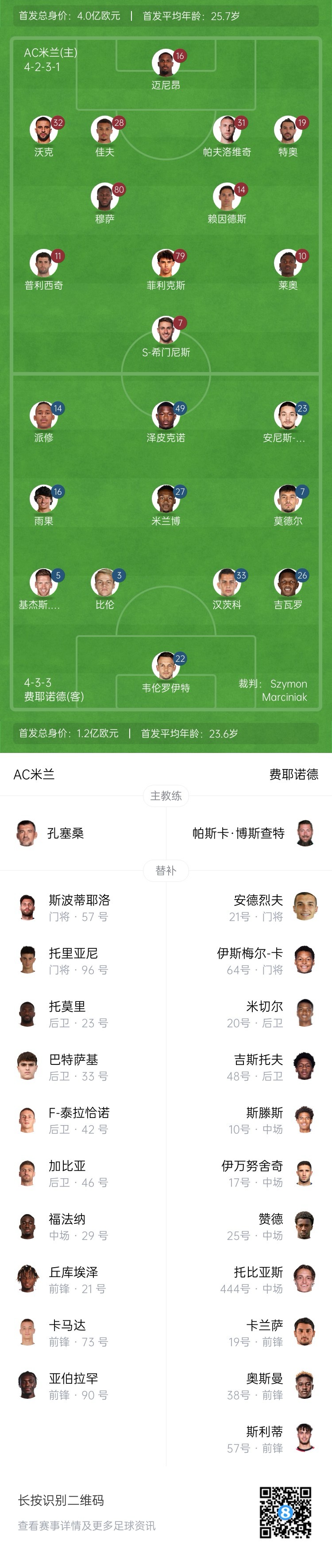 米蘭vs費(fèi)耶諾德首發(fā):S-希門尼斯、萊奧首發(fā),美隊(duì)、穆薩出戰(zhàn)