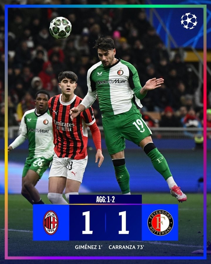 2月19日訊 費耶諾德在本輪歐冠附加賽次回合1-1戰(zhàn)平米蘭,總比分2-1晉級。