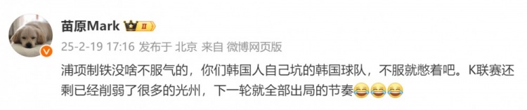 媒體人苗原發(fā)文表示:浦項鐵人沒啥不服氣的,你們韓國人自己坑的韓國球隊,不服就憋著吧。K聯(lián)賽還剩已經(jīng)削弱了很多的光州,下一輪就全部出局的節(jié)奏。