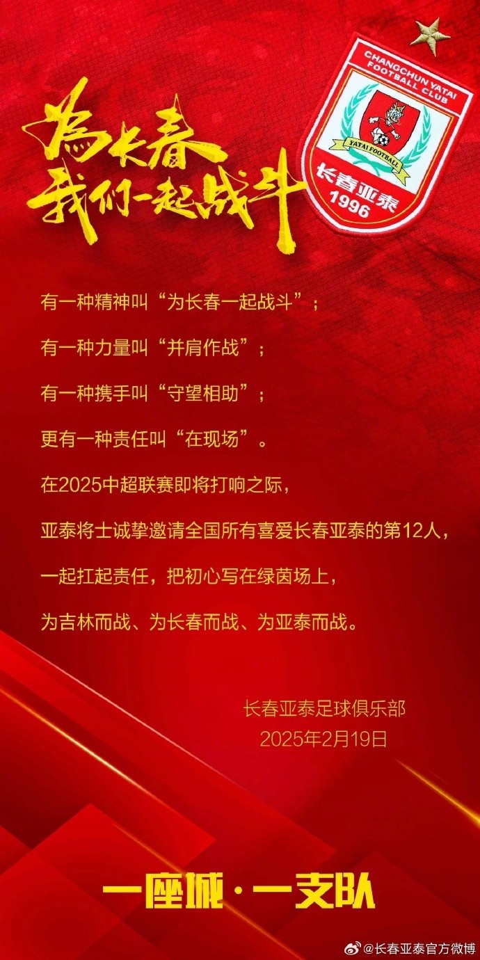 有一種精神叫“為長春一起戰(zhàn)斗”,有一種力量叫“并肩作戰(zhàn)”,有一種攜手叫“守望相助”,更有一種責(zé)任叫“在現(xiàn)場”……由于長春亞泰一直保留了將現(xiàn)役的“12號”留給第12人的傳統(tǒng),因此在出征儀式上,俱樂部特意準(zhǔn)備了一件簽滿全體教練員和球員的12號戰(zhàn)袍,由曾皎峰和謝暉共同拿起這件戰(zhàn)袍和全隊合影,希望全國所有喜愛長春亞泰的第12人,一起為吉林而戰(zhàn)、為長春而戰(zhàn)、為亞泰而戰(zhàn)。