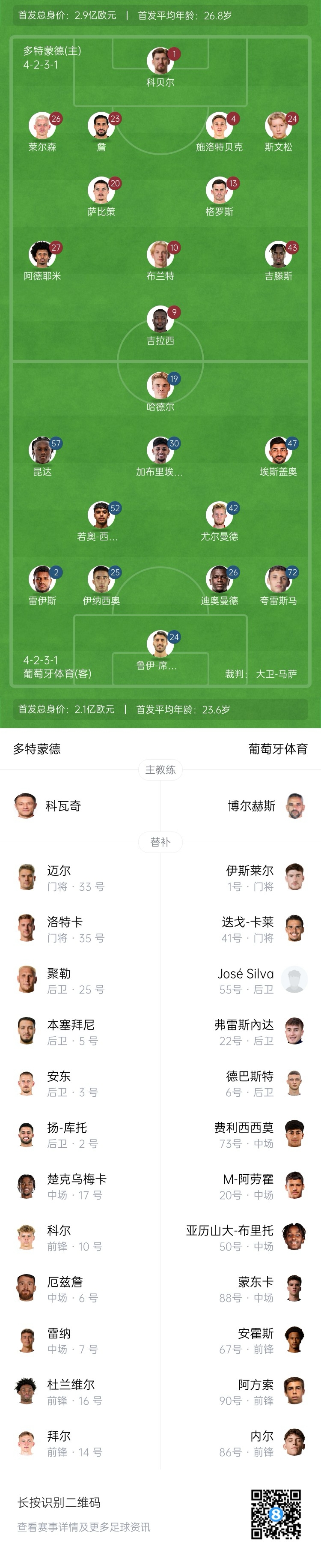 多特首發(fā):1-科貝爾、4-施洛特貝克、24-斯文松、26-萊爾森、10-布蘭特、13-格羅斯、20-薩比策、23-埃姆雷-詹、9-吉拉西、27-阿德耶米、43-吉滕斯