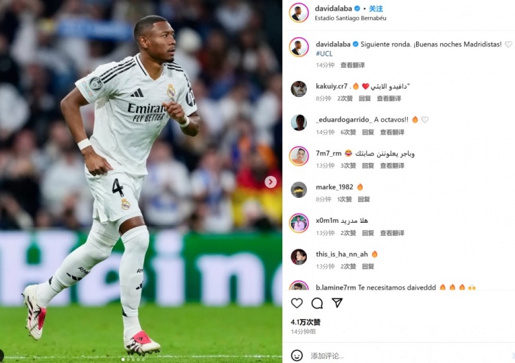 2月20日訊 皇馬在本輪歐冠3-1擊敗曼城,阿拉巴傷愈復(fù)出,在最后時(shí)刻替補(bǔ)登場(chǎng)。