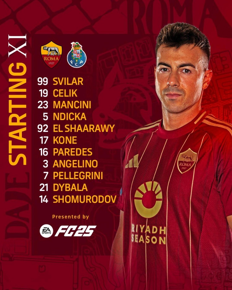 羅馬首發(fā):99-斯維拉爾、5-恩迪卡、23-詹盧卡-曼奇尼、19-切利克、3-安吉利諾、16-帕雷德斯、17-科內(nèi)、92-沙拉維、7-佩萊格里尼、21-迪巴拉、14-肖穆羅多夫