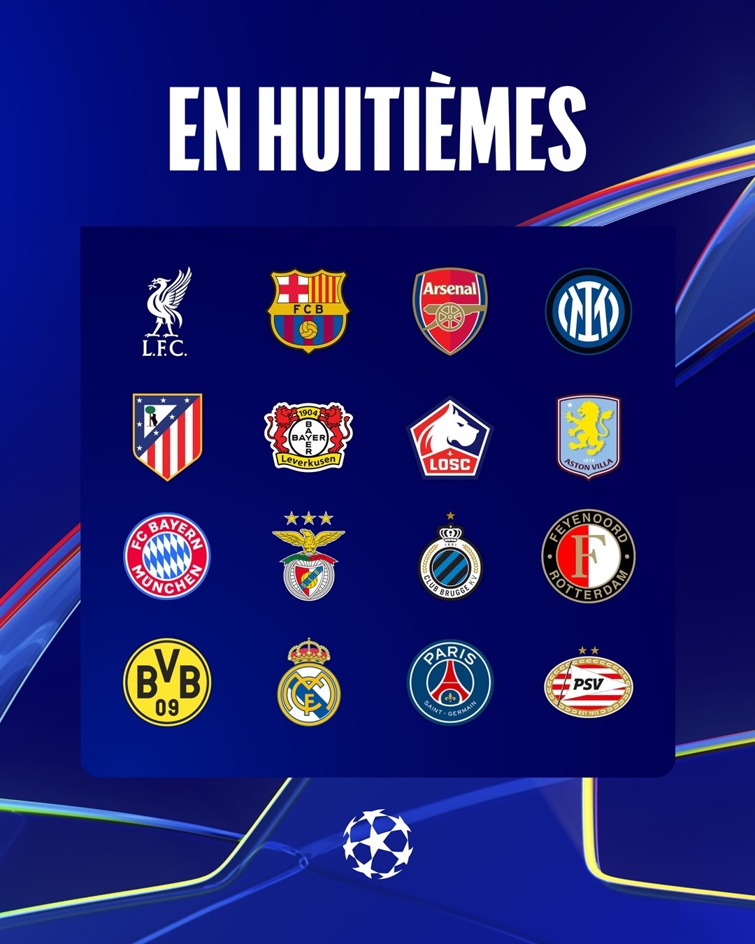歐冠16強(qiáng):利物浦、巴薩、阿森納、國米、馬競(jìng)、勒沃庫森、里爾、維拉、本菲卡、拜仁、費(fèi)耶諾德、布魯日、多特、巴黎、皇馬、埃因霍溫