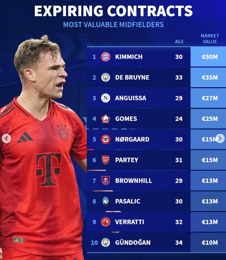 2月21日訊 《轉(zhuǎn)會(huì)市場》統(tǒng)計(jì)了合同今年到期的中場球員身價(jià)情況,基米希身價(jià)最高。