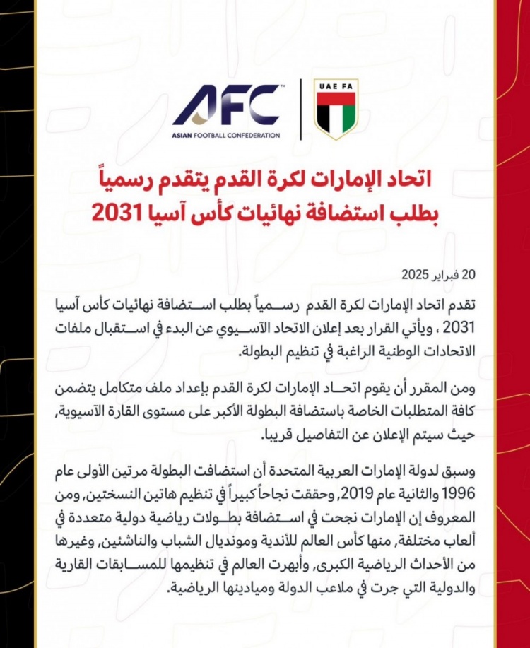 阿聯(lián)酋足協(xié)表示,他們將準(zhǔn)備一份全面的文件,其中包括舉辦亞洲杯的所有細(xì)節(jié)要求,他們很快就會(huì)公布這份文件。