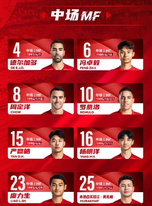 中場(chǎng):4-德爾加多、6-馮卓毅、8-周定洋、10-羅慕洛、15-嚴(yán)鼎皓、16-楊明洋、23-廖力生、25-木熱合買提江-莫扎怕、20-木塔力甫-依明卡日、39-甘超、58-廖榮祥