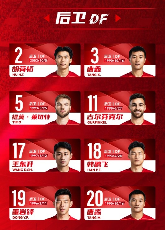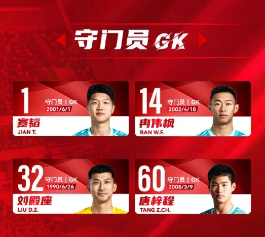 門將:1-蹇韜、14-冉偉楓、32-劉殿座、60-唐梓程