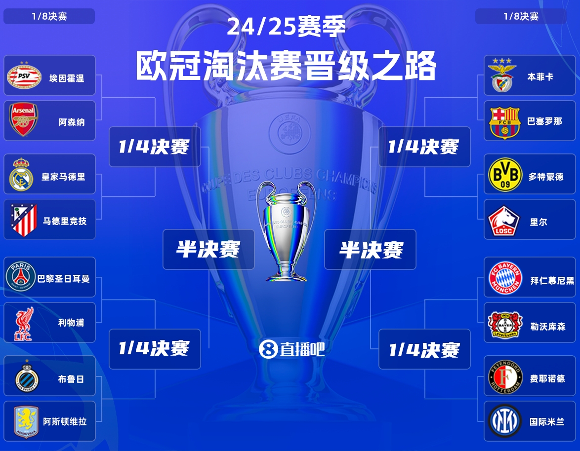 2月22日訊 24/25賽季歐冠淘汰賽賽程出爐,1/8決賽首回合將在3月5日凌晨開戰(zhàn)。