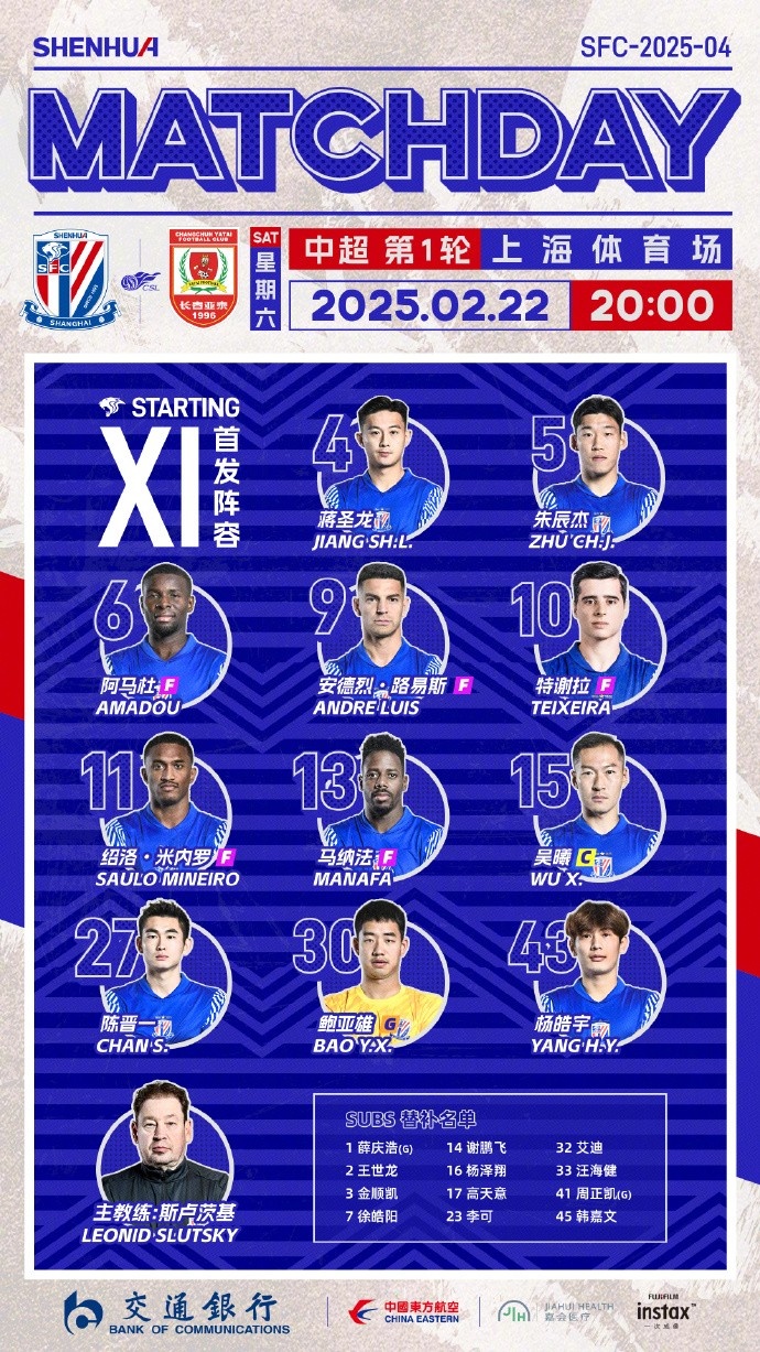 2025中超聯(lián)賽第1輪 上海申花vs長(zhǎng)春亞泰 首發(fā)名單