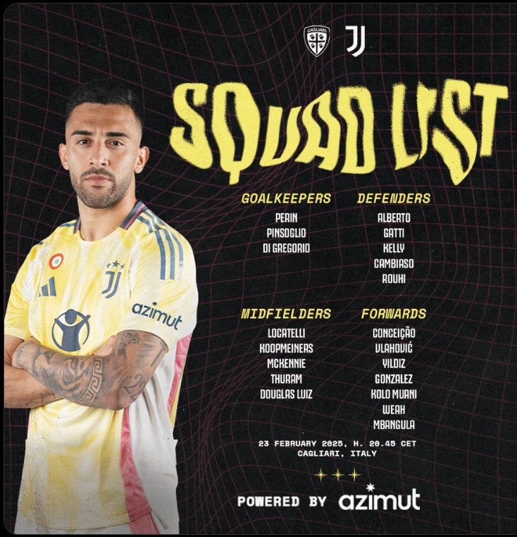 2月23日訊 本輪意甲尤文將對(duì)陣卡利亞里,球隊(duì)官方也公布了本場(chǎng)大名單,具體如下: