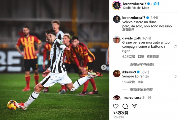 2月23日訊 近日,烏迪內(nèi)斯前鋒盧卡在社媒發(fā)文做出道歉,因?yàn)樗跒醯蟽?nèi)斯對(duì)陣萊切的比賽中拒絕將點(diǎn)球球交給隊(duì)內(nèi)點(diǎn)球手托萬(wàn)來(lái)主罰。