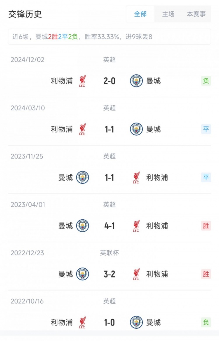 而兩隊近6次交鋒(5次英超1次聯(lián)賽杯),利物浦和曼城各取2勝,另外2場平局。在此期間,利物浦打進(jìn)8球,2次零封對手,曼城打進(jìn)9球,未能零封對手。