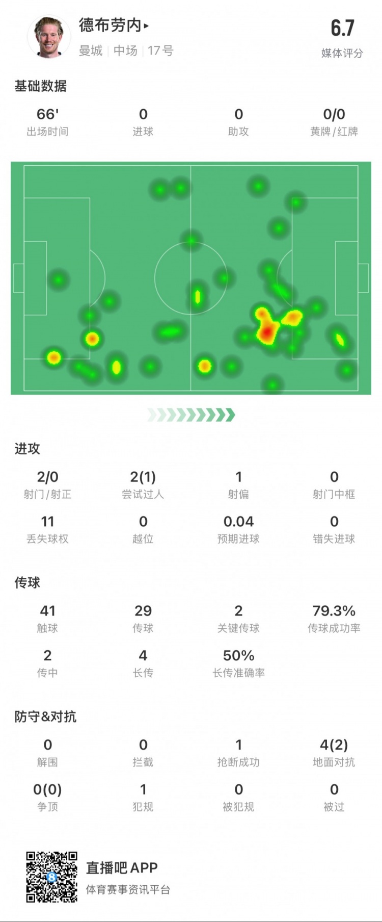 2月24日訊 本輪英超比賽,曼城對(duì)陣?yán)锲?,德布勞?nèi)本場(chǎng)數(shù)據(jù):