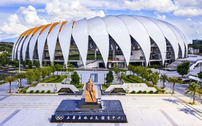 五華奧體中心惠堂體育場。五華于1979年被國家體委譽為“足球之鄉(xiāng)”,有著源遠流長的足球歷史與文化。體育場主體是由54片純白色鋁板打造而成的“羽翼”,沿主、次入口形成的中軸線對稱布置。五華縣為地級梅州市下轄縣。原來的梅縣鐵漢俱樂部主場位于梅州市梅縣區(qū),因此,梅縣鐵漢在市區(qū),而梅州客家其實在郊縣。