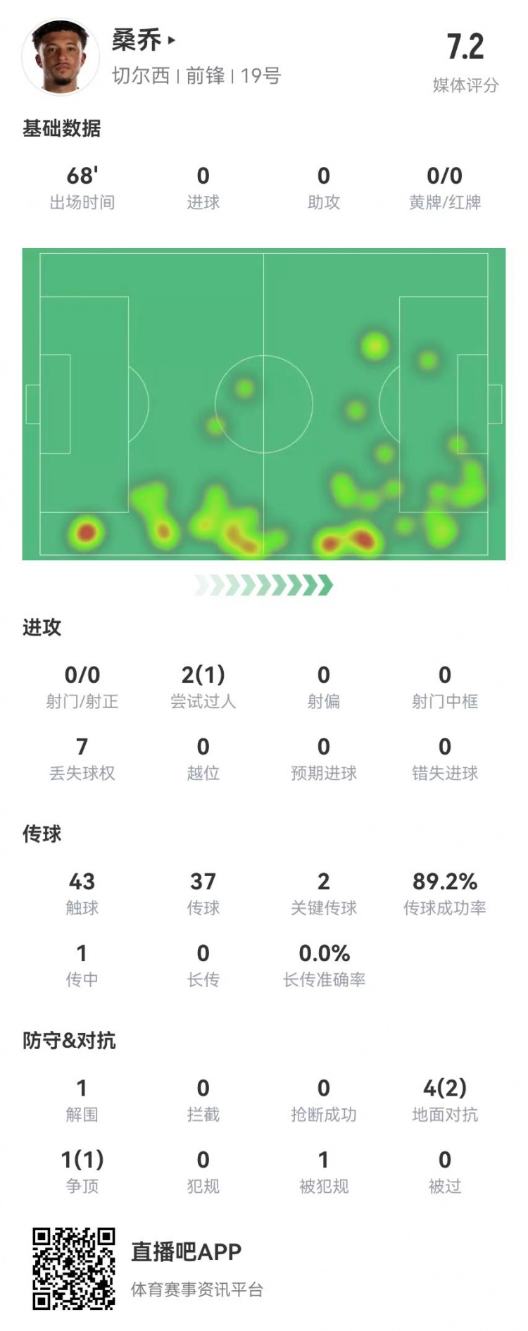 2月26日訊 切爾西在本輪英超3-0領(lǐng)先南安普頓,桑喬本場數(shù)據(jù)如下: