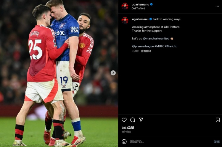 烏加特曬出自己和德拉普頂牛的照片,并寫道:重回勝利軌道,老特拉福德球場的氛圍非常棒,感謝大家的支持。加油曼聯(lián)????。