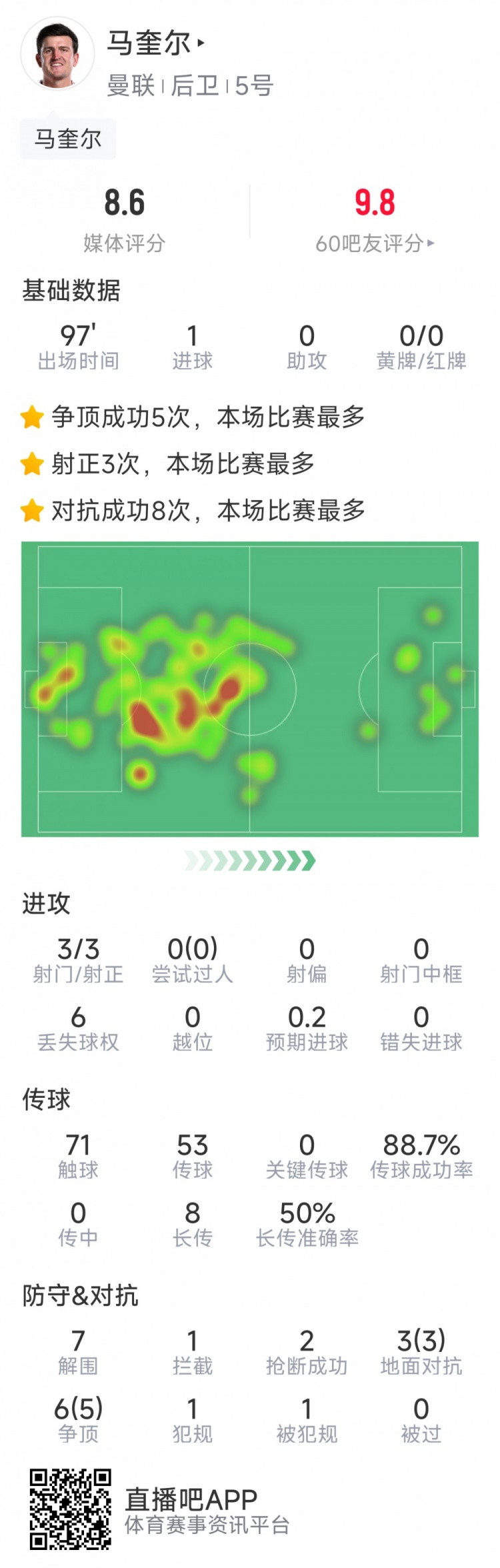 2月27日訊 在本輪英超,曼聯(lián)3-2擊敗伊普斯維奇。馬奎爾打進關鍵進球,以下為他在本場數(shù)據(jù):