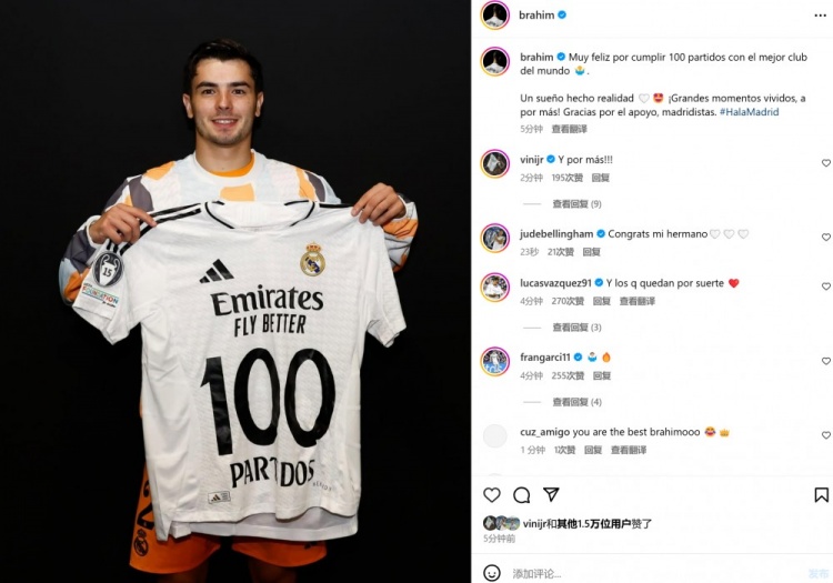 這也是迪亞斯為皇馬各項(xiàng)賽事出戰(zhàn)的第100場比賽,賽后他也在個人社媒曬出與100場紀(jì)念球衣的合影,配文寫道:“很高興能為世界最佳俱樂部完成100次出場,一個夢想實(shí)現(xiàn)了。美好的瞬間永存,讓我們?nèi)幦「?!感謝皇馬球迷的支持!”