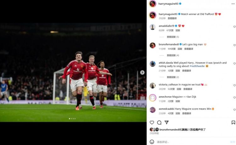 在下半場曼聯(lián)10人作戰(zhàn)的不利局面下,馬奎爾打進關鍵進球。賽后馬奎爾也在個人社媒曬出本場慶祝照,配文寫道:“在老特拉福德球場打進制勝進球!”