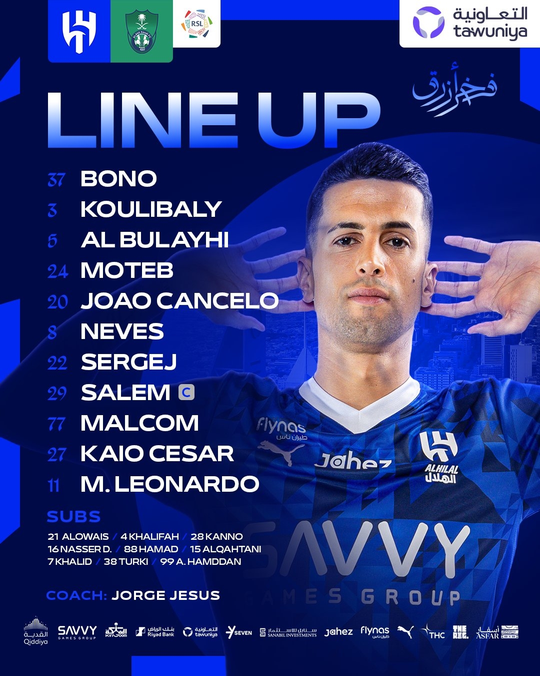 利雅得新月首發(fā):37-布努、3-庫(kù)利巴利、5-布萊希、24-穆塔卜-哈爾比、20-坎塞洛、8-魯本-內(nèi)維斯、22-米林科維奇、29-多薩里、77-馬爾科姆、27-利馬、11-萊昂納多