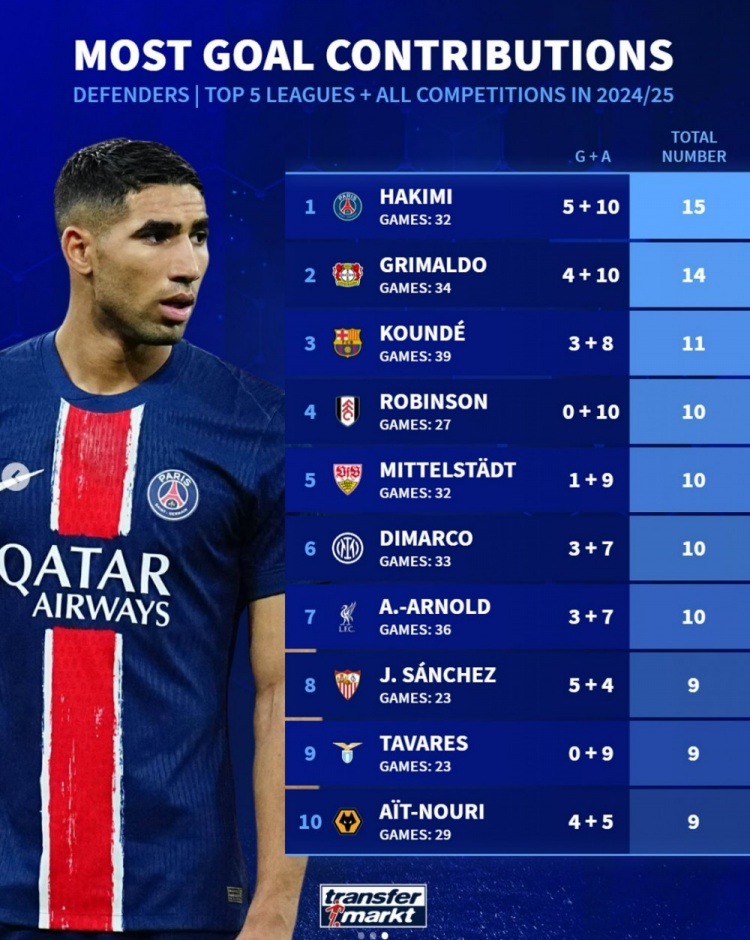 3月1日訊 德轉(zhuǎn)盤(pán)點(diǎn)了本賽季五大聯(lián)賽后衛(wèi)球員在各項(xiàng)賽事中參與進(jìn)球榜,其中阿什拉夫居首,孔德、阿諾德等在列,具體榜單如下:
